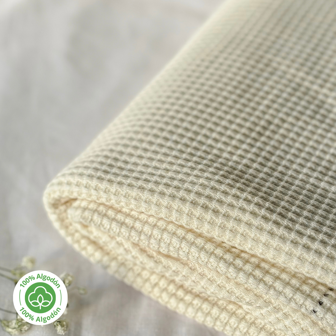 El Waffle Panal es una tela de punto, que a la vista llama la atención por tener unos “cuadrados 3d”, es esta textura que permite que la tela se sienta como esponjosa y que tenga elasticidad, es de grosor medio (ni tan delgada no tan gruesa), suave y es apta para toda época del año. Cuidados: Como es una tela 100% algodón tener en cuanta lavar con agua helada y evitar secadora, de no ser así la tela se puede achicar. Se recomienda lavar en modo algodón.
